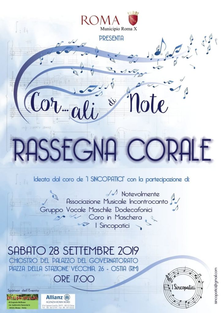 Sabato 28 settembre all’interno del chiostro del governatorato ad Ostia a partire dalle ore 17,00 si terrà una rassegna corale sotto il patrocinio del comune di Roma.